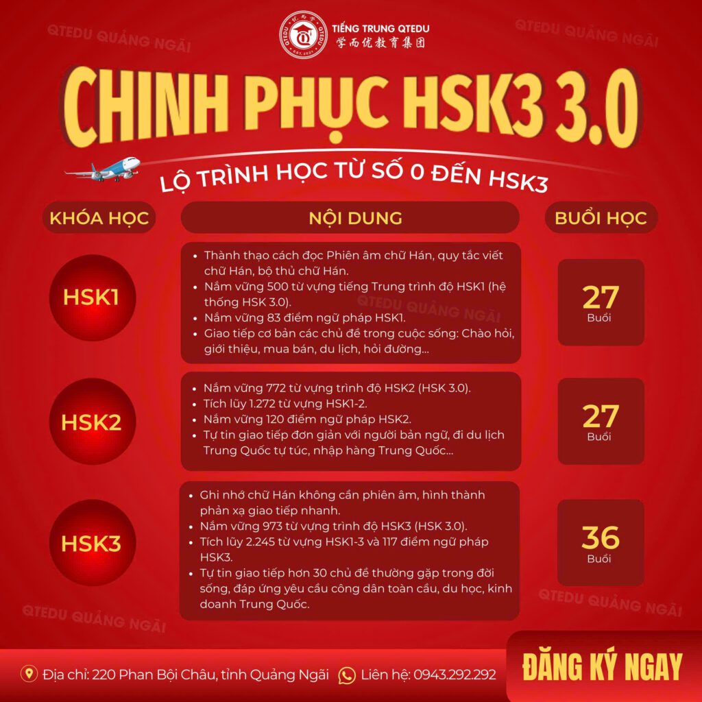Hãy đăng ký ngay khóa học HSK 3.0 tại QTEDU Quảng Ngãi để bắt đầu hành trình học tiếng Trung của bạn.
